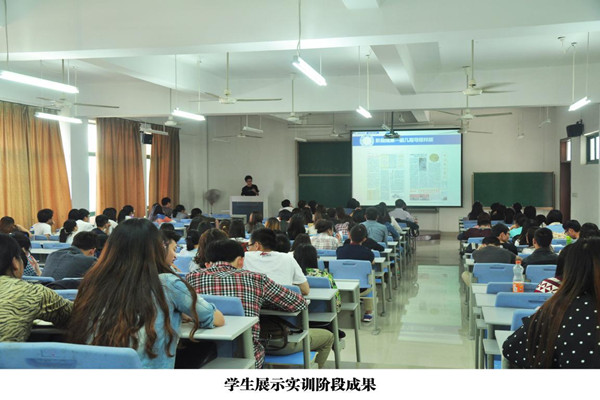 各项目组依次上台汇报实训阶段成果。“海宁长安虹桥花园精品样板房方案设计及推广”项目组为大家展现了他们团队的“地中海”、“戚枫雅居”、“小空间大生活”等主题方案设计,包括房间平面图、3D效果图、配饰方案、报价单等,实训成果颇为丰富。