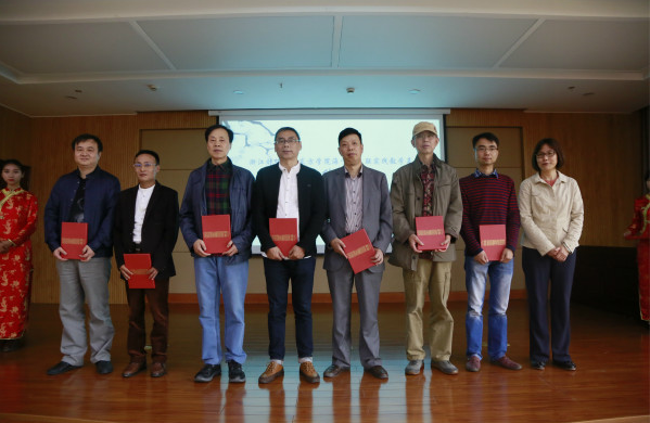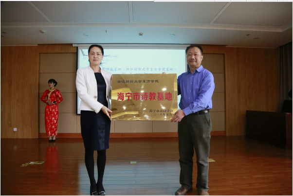 接着,海宁市文联党组书记、主席王珏宣布海宁市诗教基地在我院成立,并与学院院长沃健共同为诗教基地揭牌。
