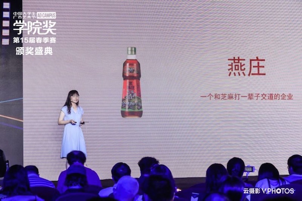 第十五届中国大学生广告艺术节学院奖自2017年1月启动以来,共收到包括清华大学、北京大学、中国传媒大学在内的1500余所高校的18.6万件参赛作品。大浪淘沙,优中选优。经过学院奖复评和终评的严格评选,我分院选送的文案作品燕庄油脂《芝麻大的事儿》入围全场大奖提名。7月19日下午,全场大奖提案PK赛在北京梅地亚中心隆重举行。邵恬恬同学在决赛现场沉着冷静,条理清晰地阐述了作品的创作思想及创意来源,并对芝麻的内涵进行了发散与阐释,赢得现场的一片喝彩。在提案点评环节,燕庄油脂品牌顾问、易合博略品牌咨询机构总裁赵一鹤认为:这是一个令人倍感惊喜的作品,它放大了企业的价值观。这句文案不仅于平凡中见精彩,更是阐述了一个行业领头企业应该肩负的责任。学院奖评审主席、麦肯光明广告有限公司顾问莫康孙先生对该作品给予极高的评价:我很欣赏这位同学精彩的提案,仿佛置身于百家讲坛的现场。虽然只是一句简单的文案,却有一种特别的力量让人回味,起到四两拨千斤的效果。之后,经过广告主评审团,媒体评审团、院校老师专业评审团及大众评审团的现场投票,《芝麻大的事儿》不负众望,最终在六件入围作品中脱颖而出,荣获全场特别大奖!