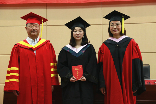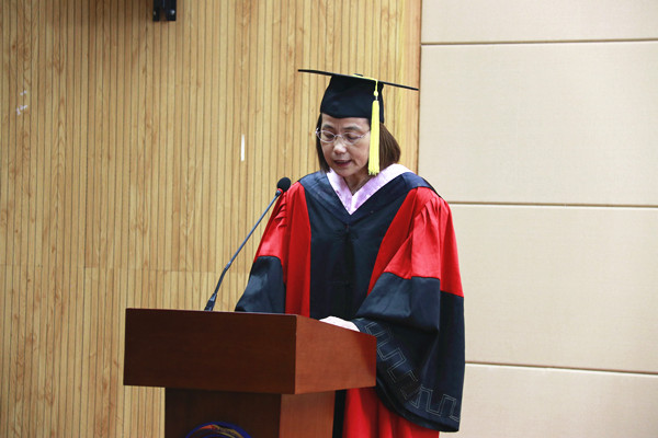 接着,分院院长陆芸代表分院致辞。她祝贺毕业生大学四年在学业上取得了优异的成绩,预祝他们在人生道路上取得更大的成就。并借此机会为在场的毕业生上了最后一节课,教导他们要学会感恩,感恩父母、师长、同学,感恩那些把自己“高高举起的人”,自信不要自怜,自强不要自弃,自尊不要自欺。