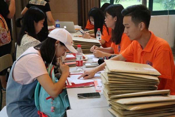 二教新生报到处人头攒动,秩序井然。迎新工作如火如荼,到处都是忙碌的身影。分院学生会的学长学姐们不厌其烦地回答着新生及家长提出的各种问题,用热情周到的服务消除新生们初来乍到的陌生感。