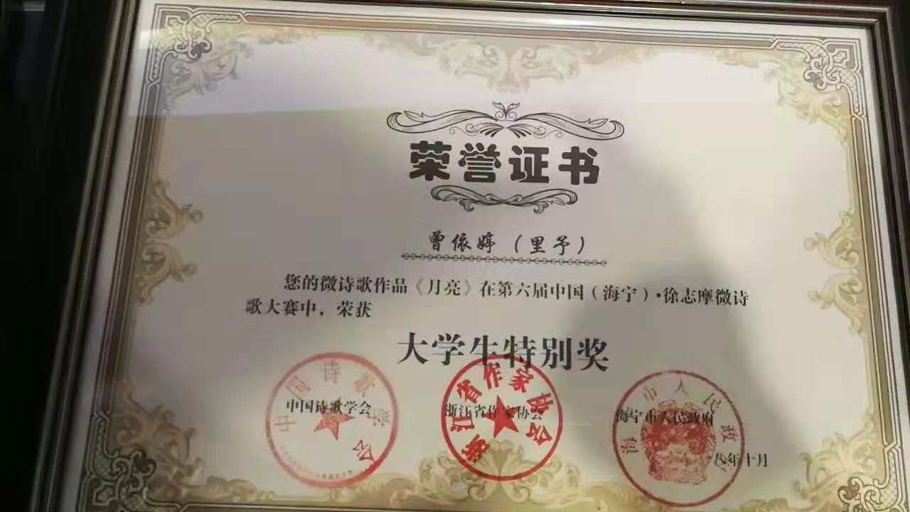 10月20日,2018中国(海宁)·徐志摩诗歌奖、第六届中国(海宁)·徐志摩微诗歌大赛奖颁奖典在浙江大学国际联合学院落下帷幕。我分院15文学1班曾依婷同学的微诗歌作品《月亮》在此次微诗歌大赛中,获得了大学生特别奖。