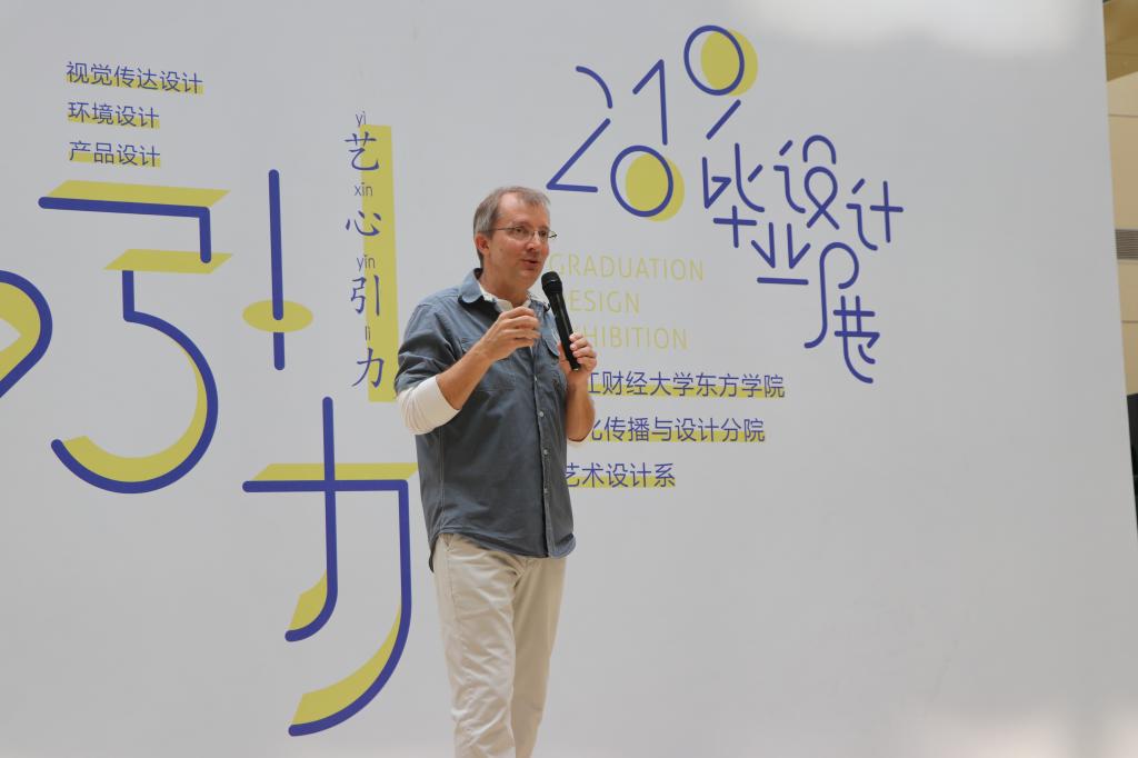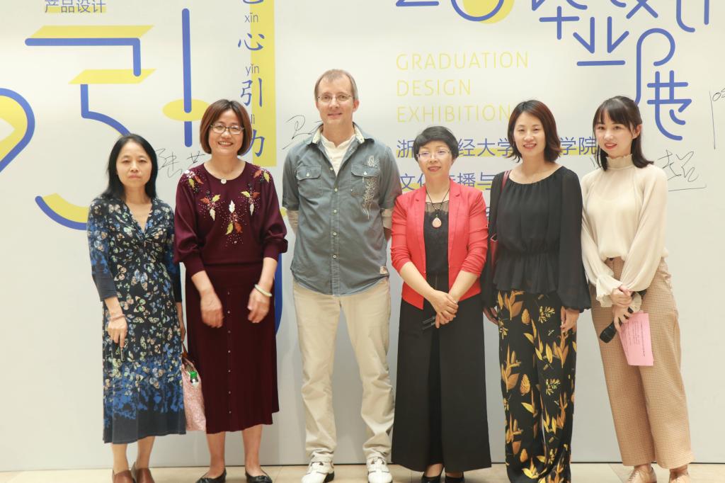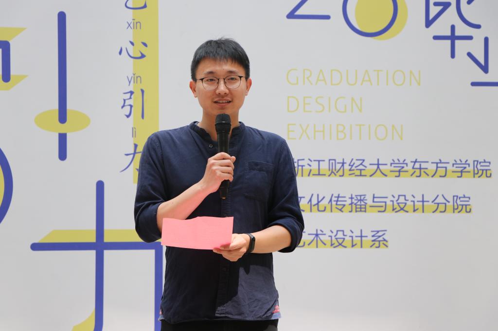昨日下午,我院2019届艺术设计系毕业作品展——“艺心引力”在杭州上峰电商产业园世包大楼拉开帷幕。亚利桑那州立大学赫柏格设计与艺术学院工业设计项目主管Joseph Pepe’Elijio Velasquez教授、浙江财经大学东方学院副院长马雪英、文化传播与设计分院院长陆芸、艺术设计系全体教师和2019届毕业生参加了开幕式。 开幕式由文设分院副院长刘怡泓主持。