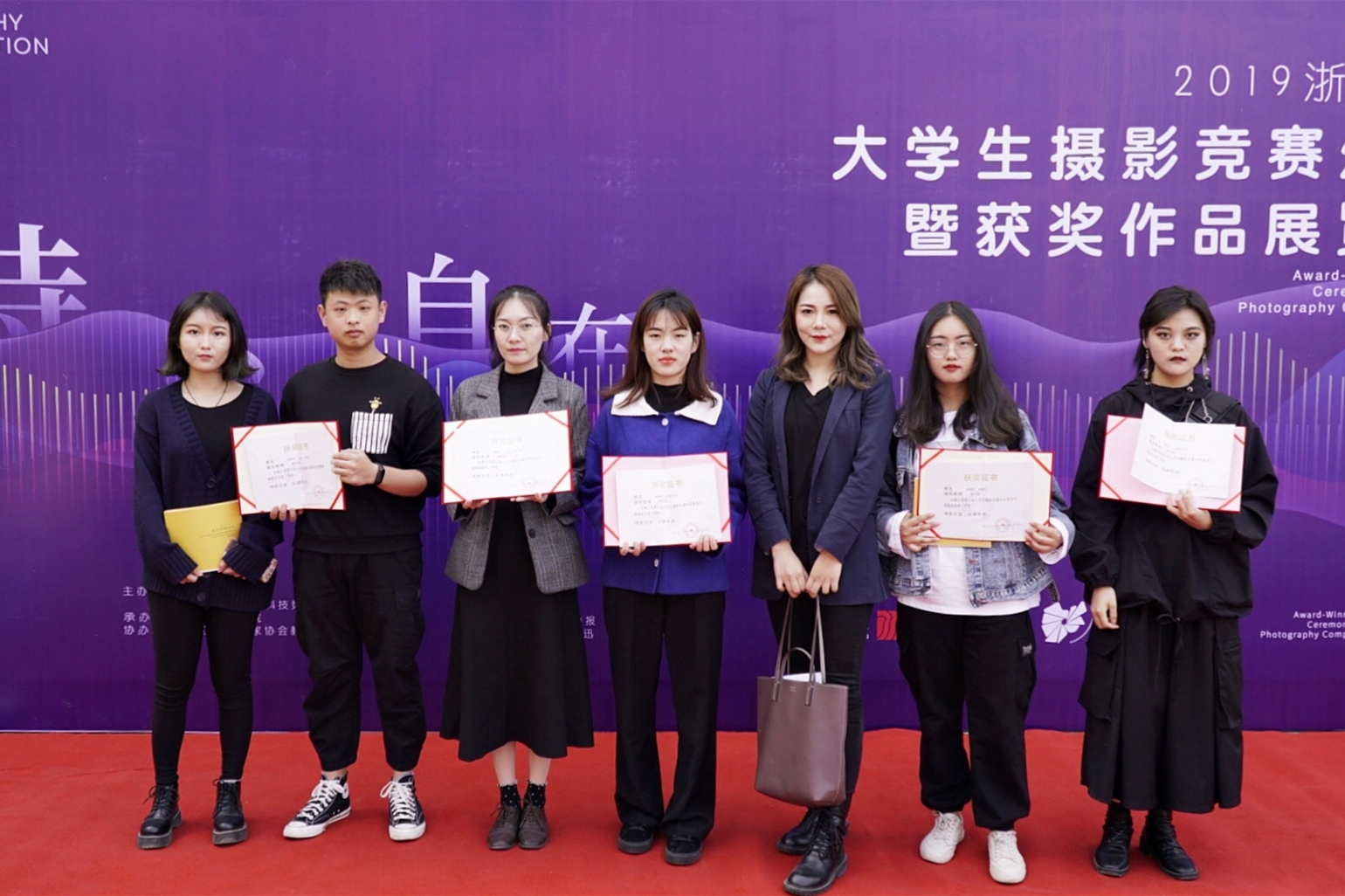 2019年11月9日,浙江省第七届大学生摄影竞赛颁奖典礼暨获奖作品展览开幕式在丽水大学生创业园区内举行。由我院文化传播与设计分院教师费宇拓指导, 广告学专业16级学生胡浩川及17级学生庞晓雯、包儒萍、颜佑吉、赵丽萍同学报送的微视频《诗在·杭州》、摄影作品《予诗予美予你》、《无商不艰》、《诗意青春》和《妆妍》经过初试及复试的激烈角逐,在75所高校1510余组参赛作品中脱颖而出,最终共获得二等奖2项和三等奖3项的佳绩。