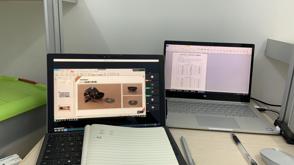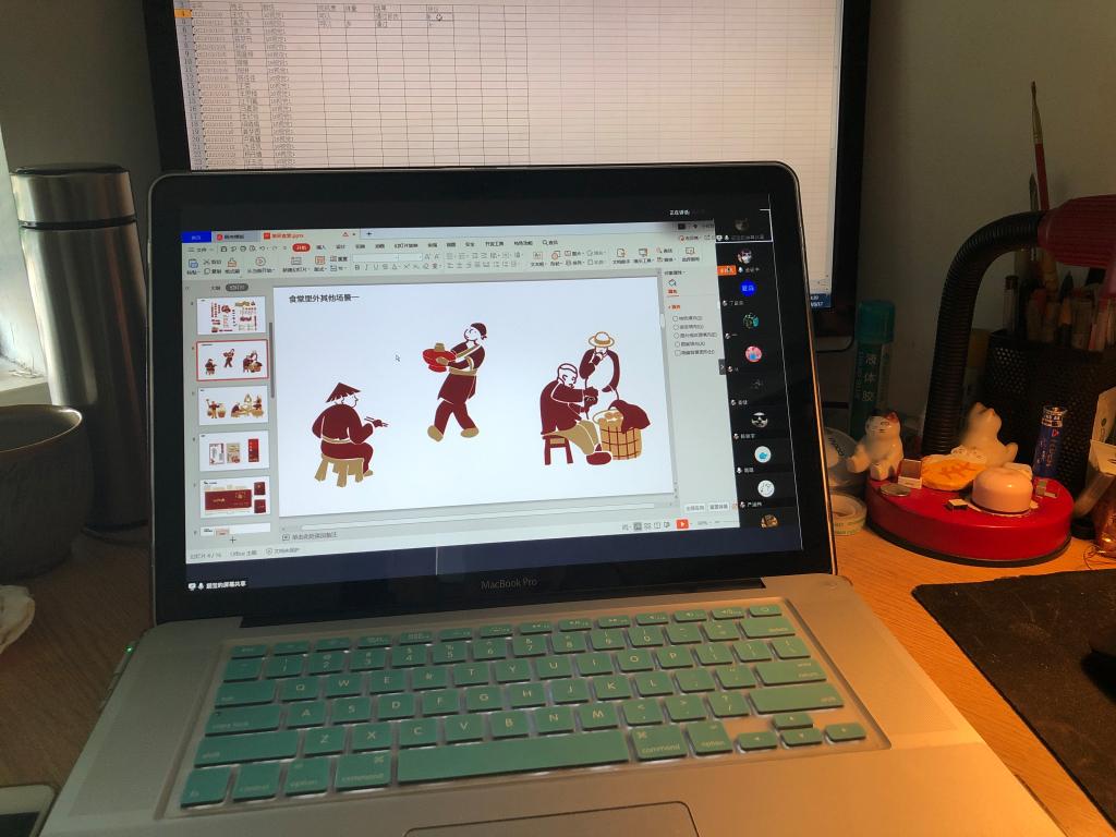 视传和产品专业的答辩主要为两项内容:作品展示和指导教师点评。参加中期答辩的同学围绕自己创作基本项目及衍生产品的创作理念、色彩风格、排版设计、创新能力等方面进行阐述。在作品展示环节,毕业生充分发挥在线会议平台的功能,通过PPT展示作品的市场调研、设计理念、设计进程以及作品模型;也有同学展示自己的草图绘制、后期效果图和作品安排;还有同学在PPT中插入实物图例,更直观的呈现自己的作品。