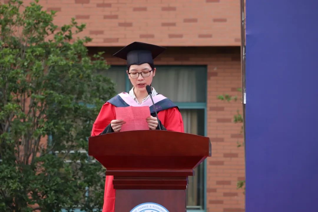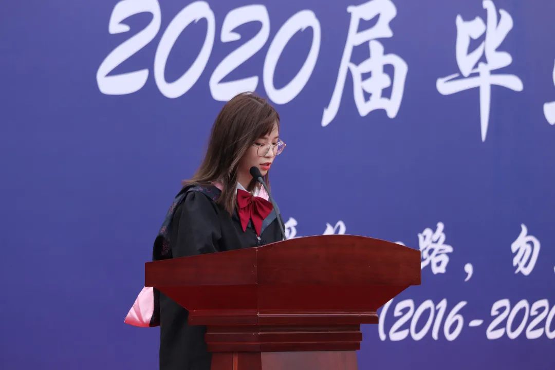 在校生代表17文学1班汪佳丽上台发言。她对初入大学时学长学姐曾经给予过的帮助和陪伴表示感谢,并送上了她对即将踏入社会的学长学姐最美好的祝愿:“愿有前程可奔赴,亦有岁月可回首。”