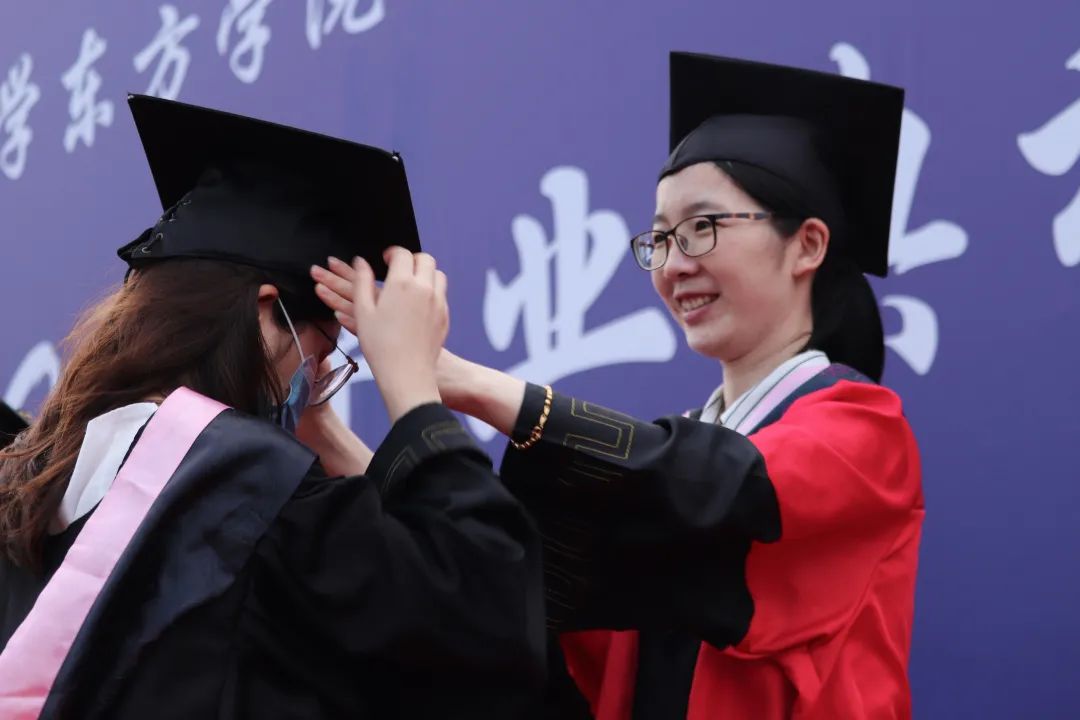 陆芸老师、陈明亮老师、刘怡泓老师、胡悦老师、李孙霞老师为每位毕业生扶正流苏,尽管彼此都带着口罩,也不能送上大大的拥抱,却依旧能从他们脸上看到掩饰不住的喜悦。