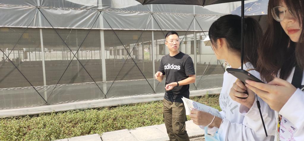 调研在五生七彩田园总经理助理傅杰的陪同下,从园区参观展开。傅杰是我院15级环境设计专业的校友,15级博雅勋杯获得者。作为项目的甲方负责人,傅杰学长带领学弟学妹们参观景区项目分区,花木大世界、各式各样的水果蔬菜种植基地、台湾创意风情街、都市蔬果体验庄园等等,一一介绍了每块项目的主要功能性和可创性,强调“两岸交流”核心内容,激发大家的创造力。