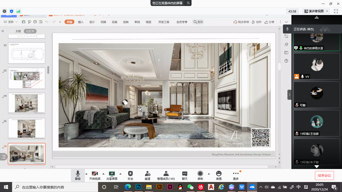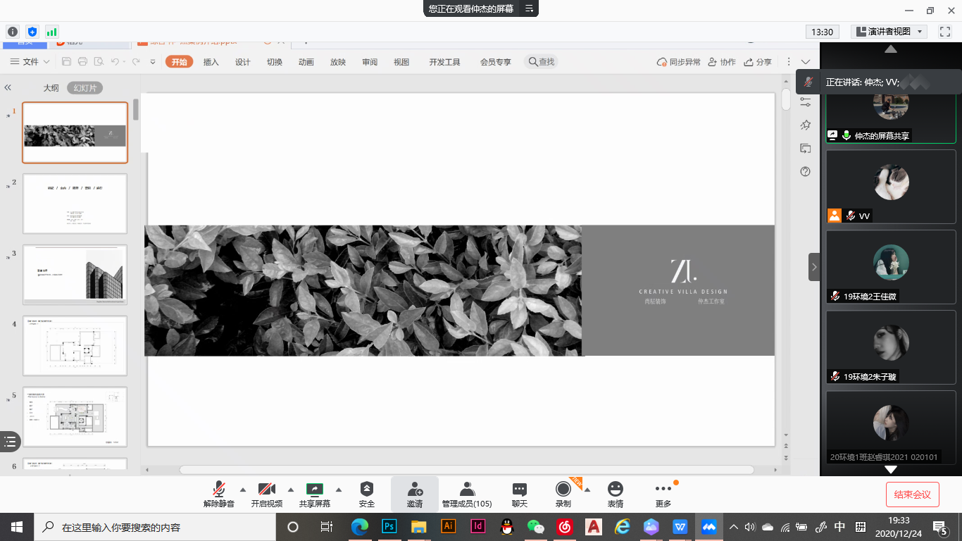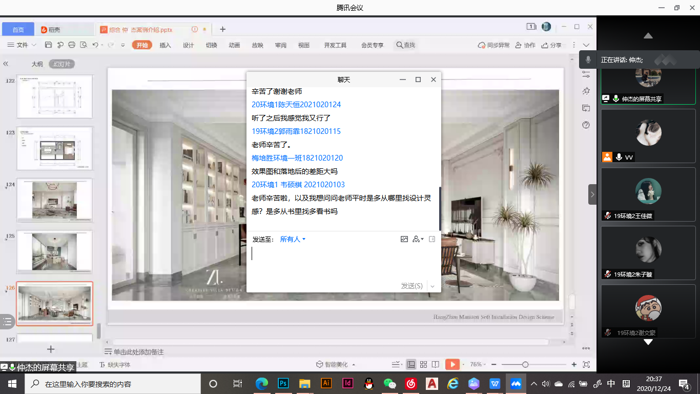 12月24日晚七点半,304am永利集团在线平台举行“环境设计专业·线上设计讲座系列”的一个别墅私宅案例云分享,环境设计专业老师史雯雯,设计师仲杰以及18、19、20级的视传、环境、服装与产品专业的学生参与了本次线上讲座。