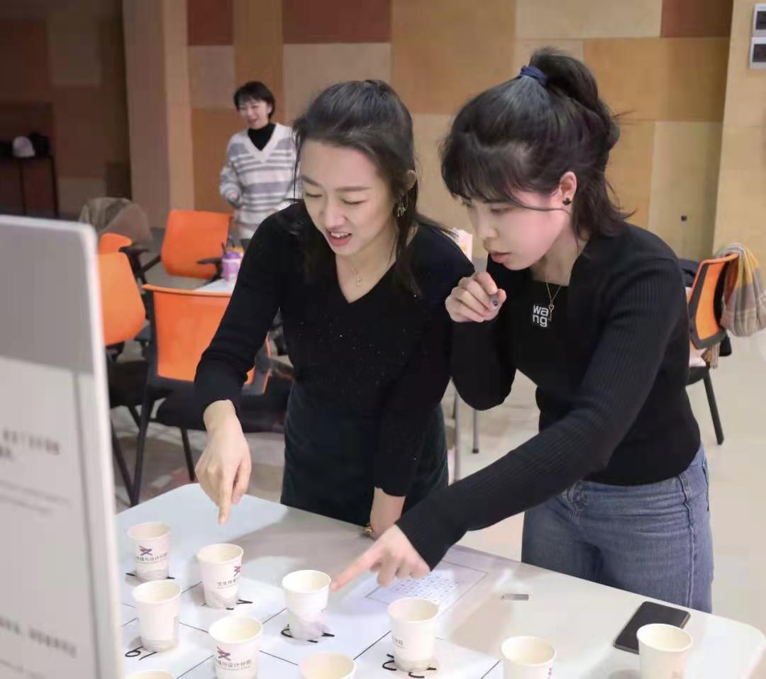 【趣味摆阵】该游戏灵感来源于《奔跑吧》,老师们分为两队在标有序号的桌上摆设装有醋的纸杯。游戏开始后,双方需要喝下对方报出的数字序号上所放置的醋,老师们认真讨论,商量“计谋”,玩得乐不思蜀。据说喝醋越多,心胸越大。“我干了你们随意”,喝醋时豪迈的架势,不禁令人感叹老师们的心胸之大。