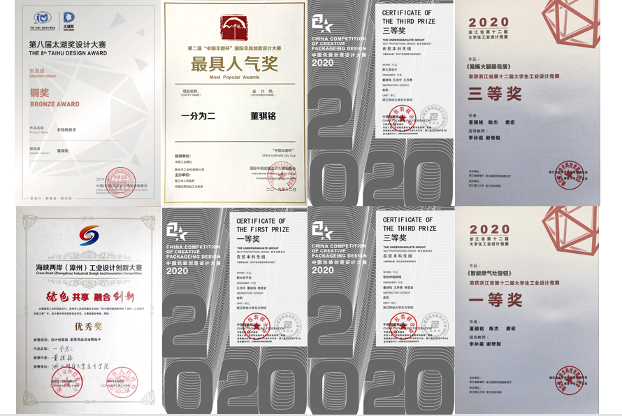 董骐铭是2017级产品设计2班学生,在校期间表现十分优异,曾获得优秀学生二等奖学金、2019-2020学年省政府奖学金、2019-2020学年三好学生、304am永利集团在线平台卓越先进个人等荣誉。他在确保专业课程均较好完成的同时,积极参加各类实践活动,在校期间成功申请实用新型专利和外观设计专利各一项,并获得第八届太湖奖设计大赛铜奖、第二届“中国伞都杯”国际伞具创意设计大赛最具人气奖、海峡两岸(漳江)工业设计创新大赛优秀奖、中国包装创意设计大赛一等奖与三等奖若干、第十二届浙江省大学生工业设计竞赛一等奖与三等奖若干。