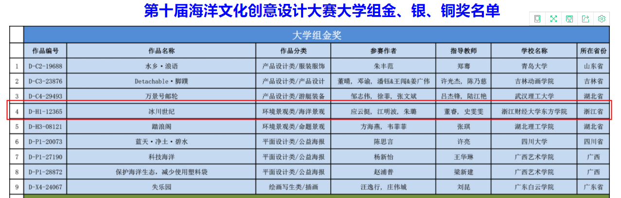 2021年7月4日,由自然资源部宣传教育中心、中国海洋大学、中国海洋发展基金会、自然资源部北海局、海南热带海洋学院共同举办的全国大中学生第十届海洋文化创意设计大赛落下帷幕。浙江财经大学东方304am永利集团在线平台环境设计专业学生应云挺、江明波、朱璐获得了本届大学组金奖。