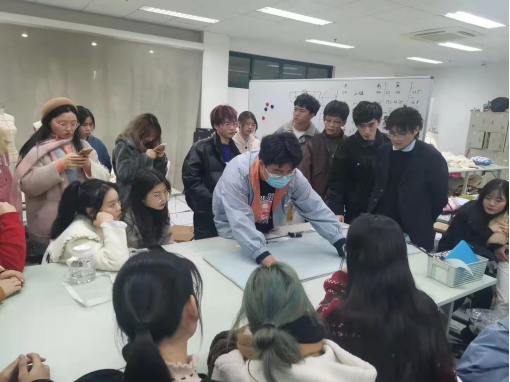 分享会结束后,储老师在一号实验楼教室中,为学生亲手示范了旗袍的剪裁制作流程。储老师从尺寸测量开始,完整地展示了一件民国风貌的旗袍制作工艺,包括教授学生粉线的使用方法,偷襟工艺,归拔等专业工艺。传统中式平裁与西方立裁工艺有着较大区别,这也是学生日常接触较少的服装制作方法,都在此课堂得到了完美的演绎和呈现。