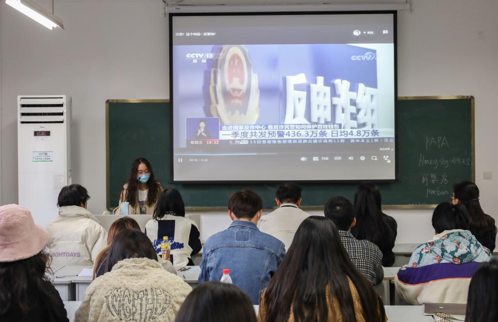 班会上,19服装1班团支书吴想妹通过消防篇、交通篇、新冠疫情篇、心理健康篇和防诈骗篇五个篇目,结合实际并通过互动的形式分享校园安全小知识。防范电信网络诈骗为最重要的安全问题,吴想妹同学以生动详实的案例和视频传播防诈知识,展示国家反诈App的正确使用方法,帮助同学们学会理性思考,传授大家自我保护的防诈技巧,切实提高了大家识骗、防骗的能力,共同构筑起校园安全的屏障。
