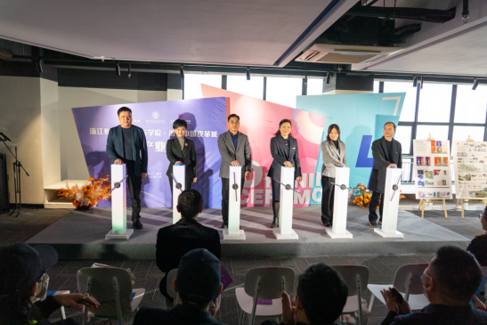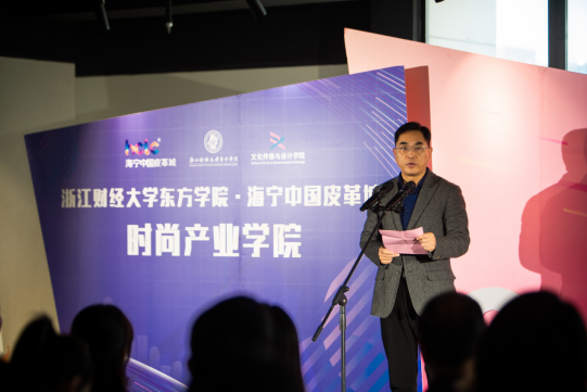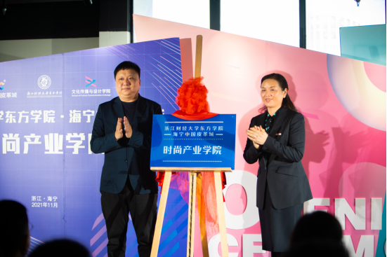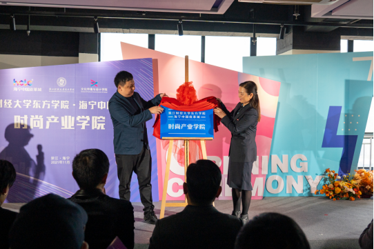 浙江财经大学东方学院院长叶东惠、海宁中国皮革城股份有限公司副总经理朱杰共同为时尚产业学院揭牌。海宁市人民政府副市长杨文华、海宁中国皮革城股份有限公司副总经理朱杰、海宁市时尚产业中心副主任戴璐、浙江财经大学东方学院院长叶东惠、浙江财经大学东方学院党委书记申屠莉、浙江财经大学东方学院副院长蒋钰明上台为时尚产业学院按下启动键,宣告浙江财经大学东方学院—海宁中国皮革城时尚产业学院正式启用。