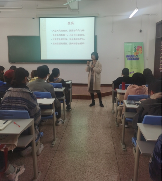 观摩课上,蔡敏敏老师从展示优秀学生作业作品入手,引发同学们对诗歌押韵的好奇,接着深入浅出地为同学们讲解诗歌的押韵规律。通过对自己的诗社名“一东诗社”由来的介绍,让大家更直观地了解了平水韵及其在诗歌创作中的地位,并借助大量大家耳熟能详的古代经典诗词,引导同学们发掘诗歌的韵律与韵脚,总结归纳其中的规律。