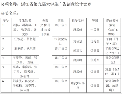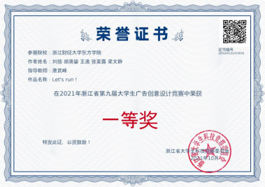 同时还有多组同学获得了奖项,特别是刘杨、胡澳鋆等同学的策划书作品《LET’S RUN》获得浙江省一等奖,策划书思路严谨、表现生动,特别是良好的现场答辩风格,赢得了评委老师的一致赞誉。