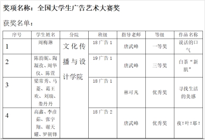 能在全国大学生广告艺术大赛频频获奖,广告系主任吴欢超老师总结,一是广告学专业注重实践化培养模式,把学生实践技能的培养当做首要任务,课堂教学和业界发展高度契合,把实践和竞赛融入课堂教学;二是老师和学生高度重视,投入大量的课外时间,反复打磨作品,精益求精,使之在全国的舞台能够脱颖而出;三是加强了课程群的建设,把广告创意、广告策划、广告文案写作等多个模块,协同教学,互补互通,提高学生整体解决问题的能力。(图文/唐武峰,编辑/毛豆)