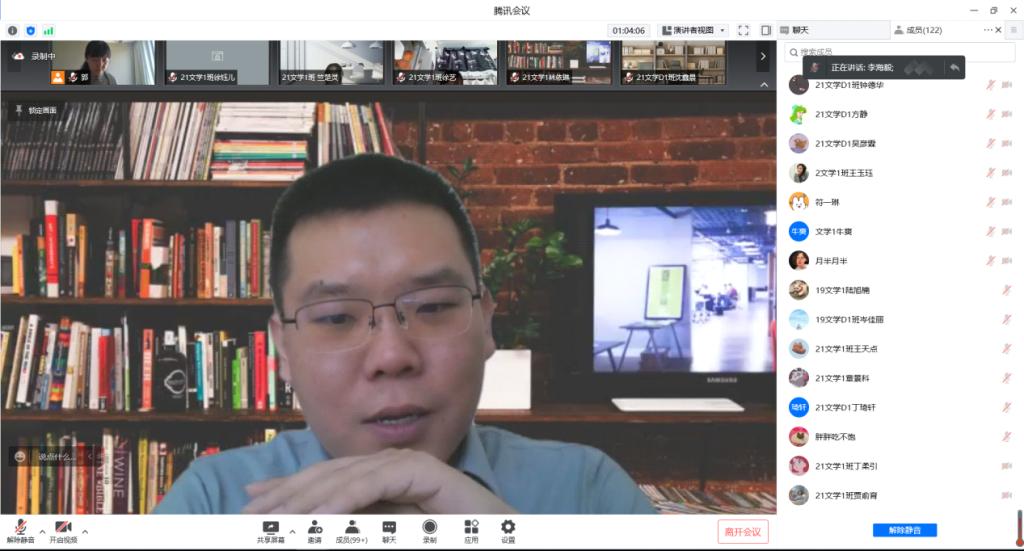 2022年5月3日上午,由邢台日报社全媒体记者、邢周报出版中心副主任李海毅主讲的讲座“实现沉浸式田野调查并写作”在线上如期举行。讲座以基层采访实践为例,重点讲解如何最大限度利用田野调查获取信息,针对田野调查采访前的准备工作、调查采访中的敏感信息捕捉和调查采访后的材料梳理以采访信息权重的比较分析和取舍等方面。本次讲座为中文系“业师进课堂”系列活动之一,由中文系郭振伟老师主持,21文学全体同学及19文学观堂文社成员共120多人参加。