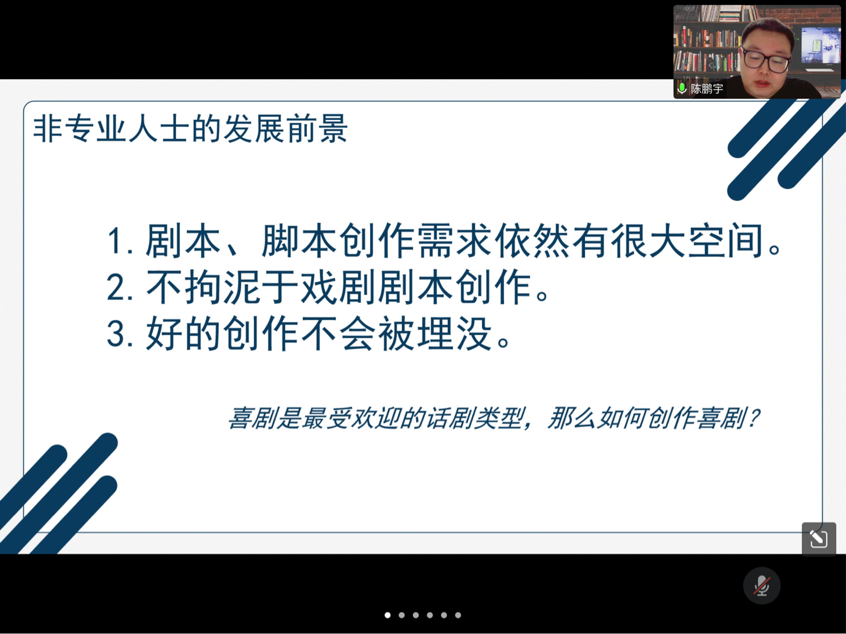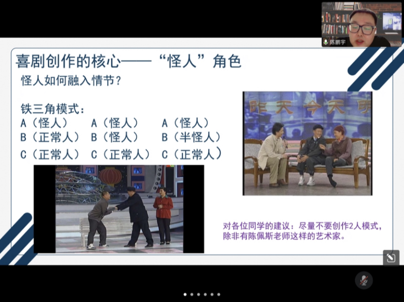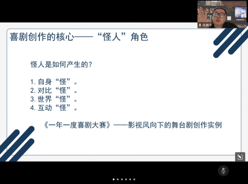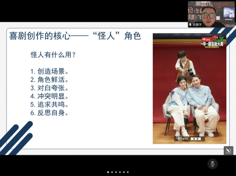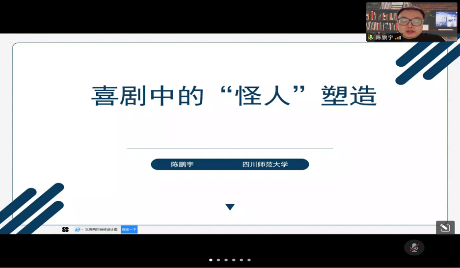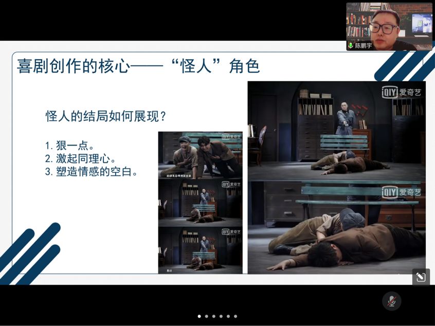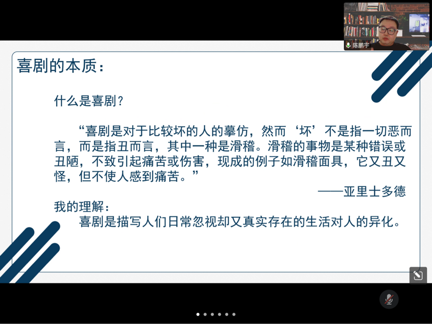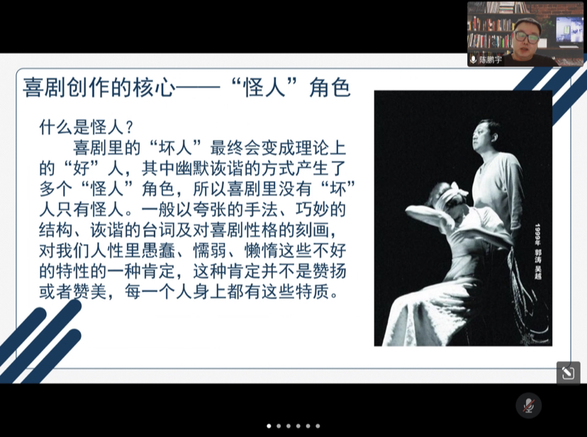 2022年5月24日晚上18:30,304am永利集团在线平台邀请陈鹏宇老师开展以“喜剧中的‘怪人’塑造”为主题的线上讲座。参加本场讲座的有19文学壹心欢戏剧社和20文学全体同学。