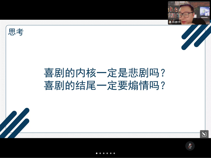 在讲座的后半段,陈老师提出了两个思考问题并讲述了自身的看法。从理论上来说,他认为喜剧的内核不一定是悲剧,可以有悲剧的成分;喜剧的结尾要煽情,特指能让观众引起共鸣的“情”。