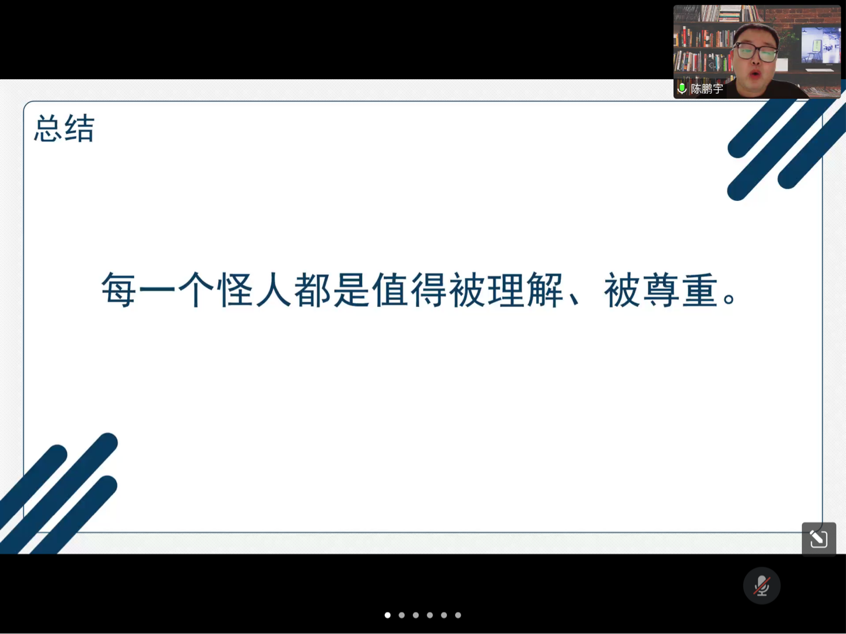 陈老师说:“每一个怪人都是值得被理解/被尊重。”他希望同学们作为一名创作者,按照一个“怪人其实并不怪,只是不知道该如何表达内心情感”的原则,去塑造作品中值得被理解和尊重的“怪人”角色。