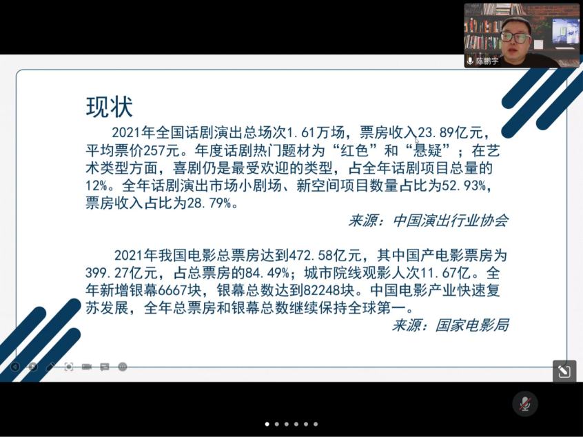 陈老师给我们展示了行业现状,2021年全国话剧演出总场次1.61万次,票房收入23.89亿元,平均票价257元。年度话剧热门题材为“红色”和“悬疑”;在艺术类型方面,喜剧仍是最受欢迎的类型,占全年话剧项目总量的12%。
