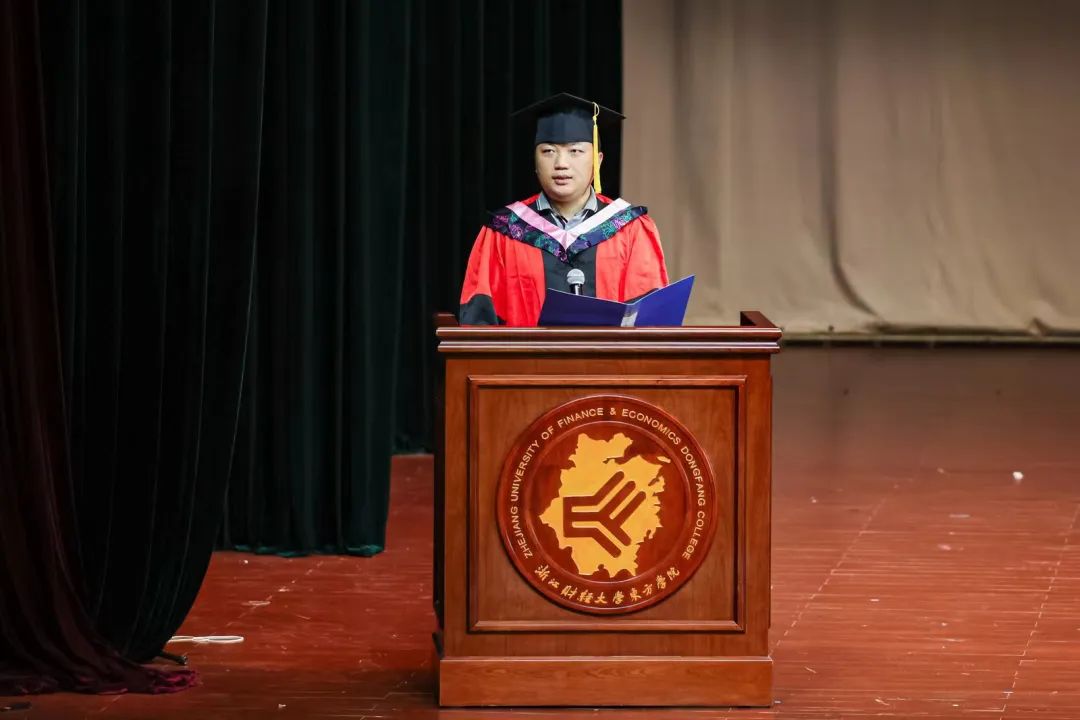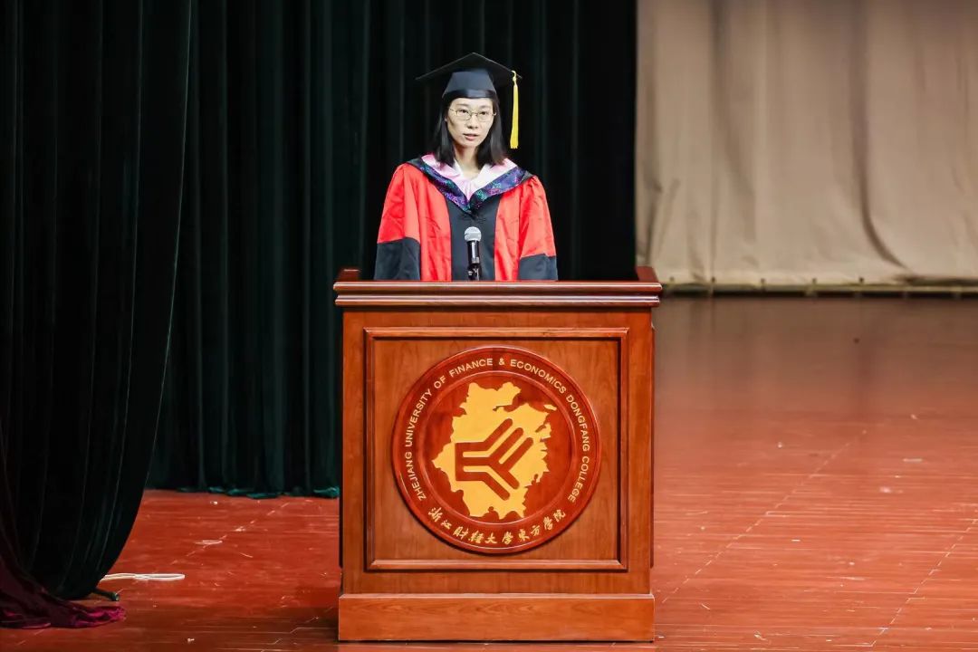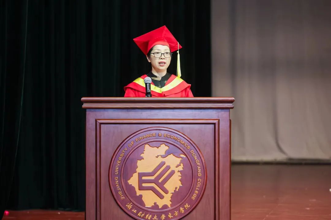 毕业典礼在庄严的国歌声中正式拉开序幕。典礼伊始,浙江财经大学东方学院副院长马雪英发表致辞。她祝贺毕业生们成功从大学毕业,并送上了衷心的祝愿:“且立青衿之志,他日定成青云!”。她还列举了毕业生们这四年来在文体类赛事和学科竞赛上所获得的赫赫功绩,并对此表示了高度的赞扬与肯定,希望毕业生们在前行的路上谨记院训“进德修业,与时偕行”,在时代的洪流中找到属于自己的使命,无论在何种高度都莫忘初心。最后,她再次对毕业生们表达了自己的期盼与祝愿,并表示母校永远是同学们的家。