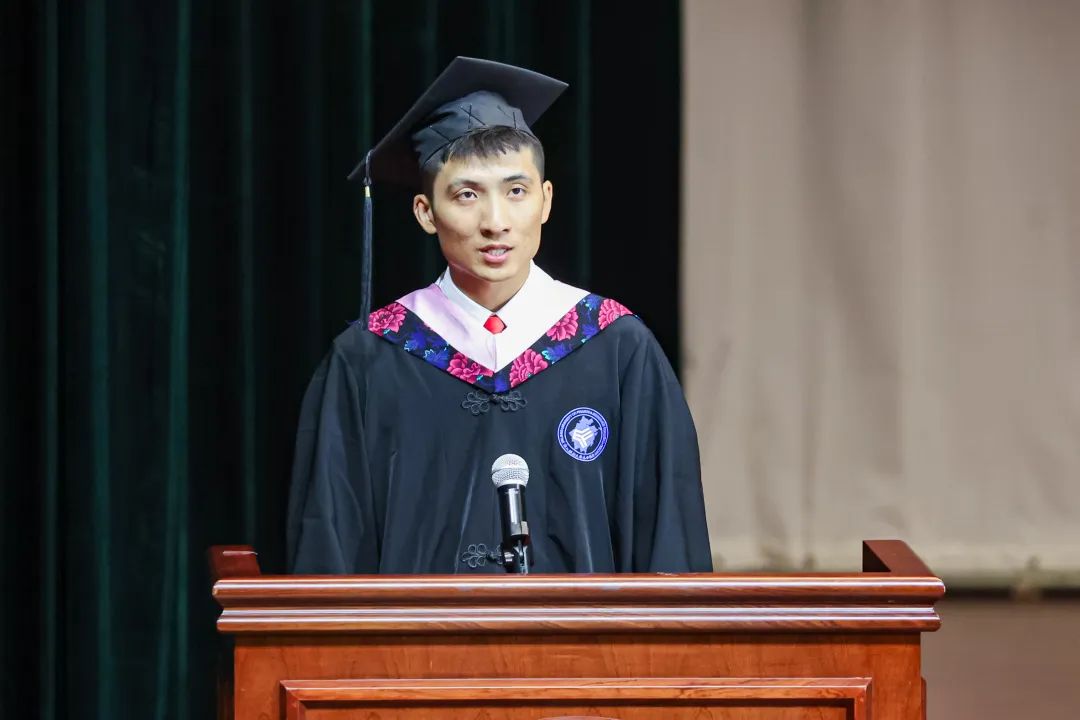 毕业生代表18环境2班王志翀同学上台发言。他代表毕业生向曾经教导陪伴过他们的师长们亲友们表达最真诚的谢意,感谢他们在其成长路途中给予的勇气与帮助。面对新征程,他相信坚持好的人生态度会让人们在成功道路上少一些弯路和抱怨,多一些机遇和赞许。随后,他再一次感谢文设领导和老师四年来对同学们的关心和教育,并且表示未来也会以优秀的业绩彰显母校的风采。最后,他衷心地祝愿母校更加美丽,老师们工作顺利,同学们前程似锦,一帆风顺。