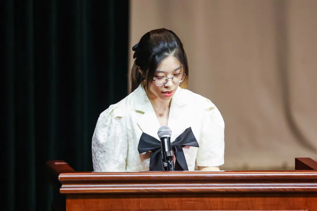 在校学生代表19文学1班的尚芝慧同学上台发言。她希望正处于迷茫、焦虑的毕业生们在未来能以饱满的精神与状态,朝着既定的方向继续前进!也希望学长学姐们在今后的日子里,能够时刻谨记老师们的教诲,谨记“博文立人,雅艺立业”的理念,做一个“博文雅艺”的青年。她还对曾经帮助过她的学长学姐们,表达了最真诚的感谢之情。在发言的最后,尚芝慧同学代表文设学院全体在校学子祝贺毕业生们毕业快乐,在未来的路途中,挥洒青春,描绘人生的美丽画卷!