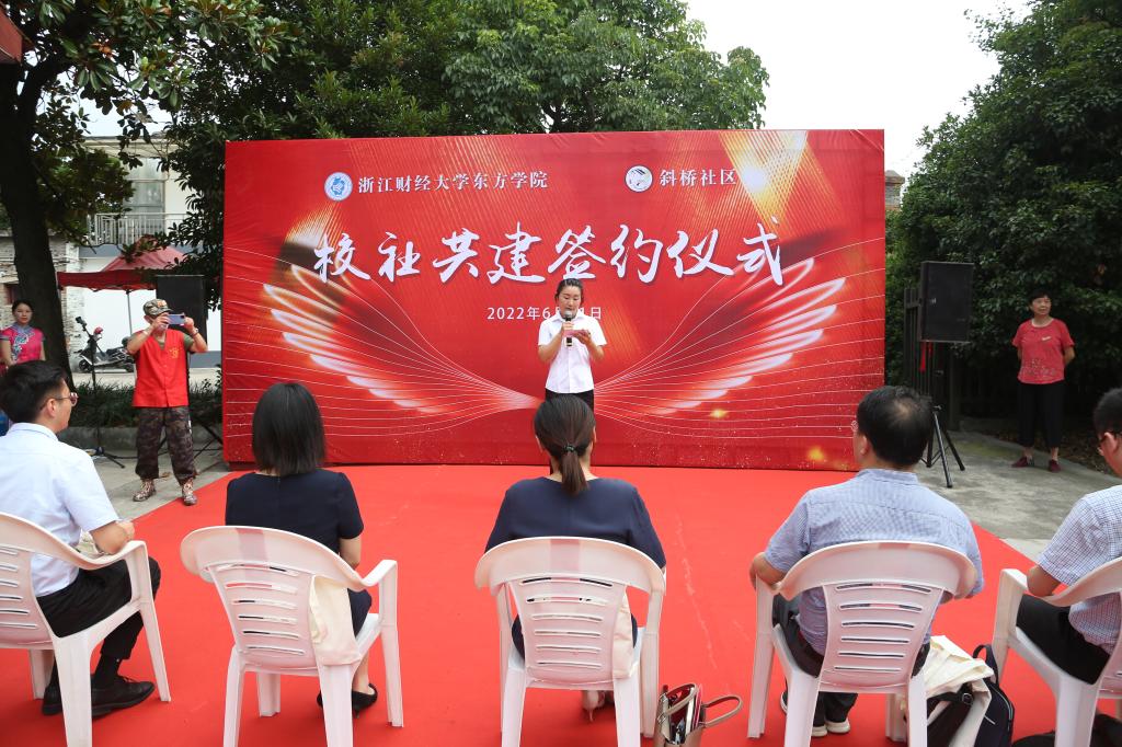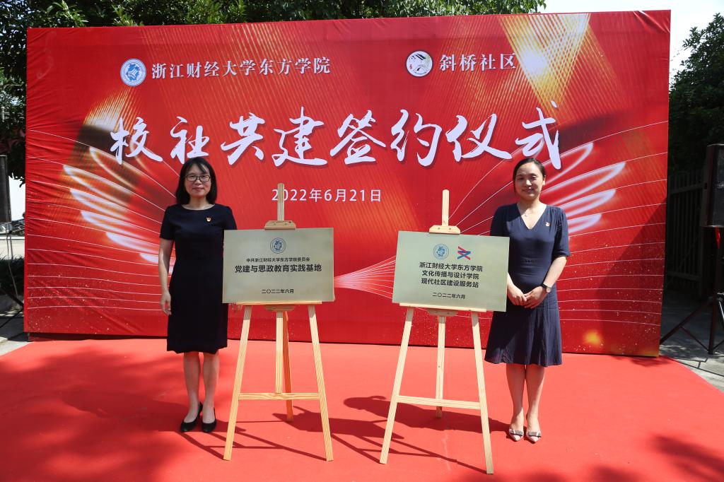 斜桥社区党委书记张秀丽与文设学院党总支书记陈明亮共同签署共建协议。