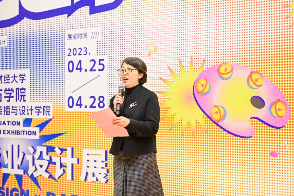 马雪英在致辞中表示,历经三年疫情,我们对于重新走出校园举办毕业展特别充满期待。她对本次毕业展开幕表示热烈祝贺,对所有为本次展览辛苦付出的指导老师、参展同学表示亲切慰问与诚挚感谢,同时高度赞扬了文设学院几个设计专业通过毕业展所呈现的实践成果,并为毕业生们送上了真挚的鼓励和祝福。