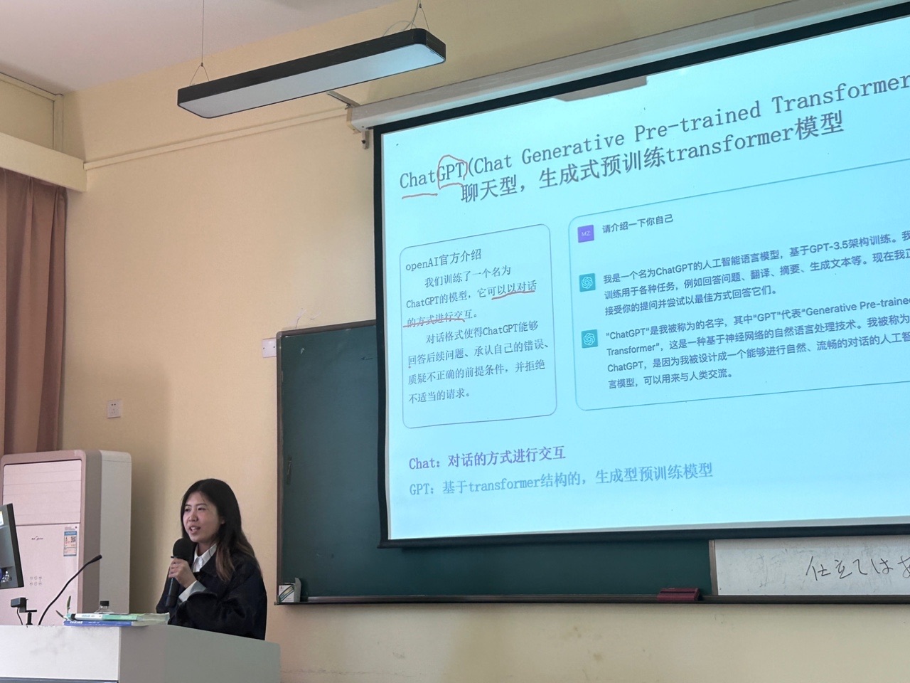 宋老师先对“生成式的人工智能”以及GPT的文字概念进行了介绍,接着重点讲述了文本内容生成的人工智能模型,并对如何使用作了示范。GPT的出现对中文教学带来了挑战和机遇。在文学创作过程中,GPT在搜索材料和拟定初稿上具有优势,但最终修改仍需依靠创作者的文学素养与审美能力。