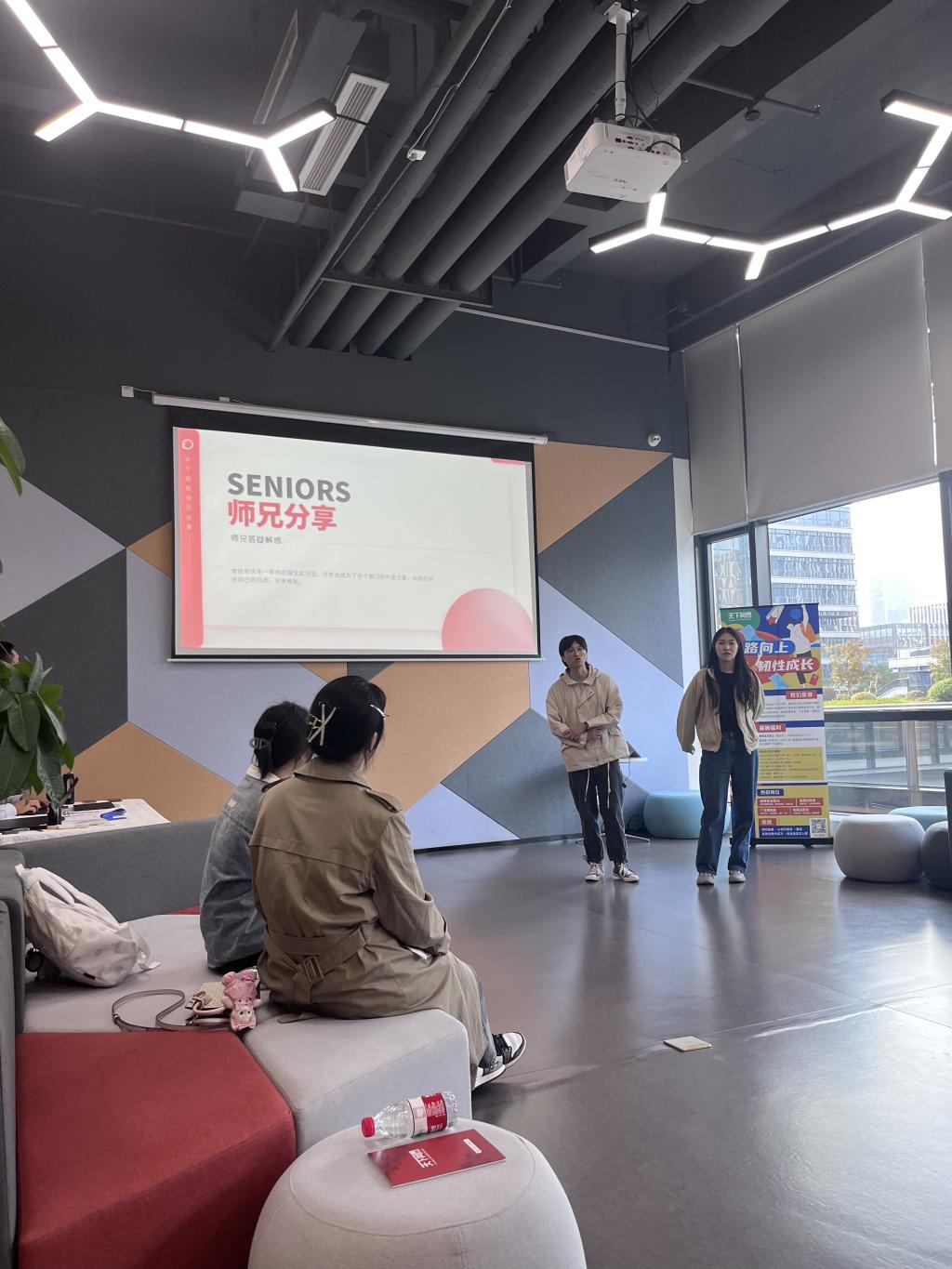 在本次访企拓岗中,我院师生通过宣讲会、实地参观等方式,充分感受了该公司的企业文化。相关工作人员介绍了该公司的发展历程、业务板块、工资福利、校招流程、招聘岗位等。营销策划专家罗诗淇、资深编导雷骏航作为广告专业校友,从学长学姐的角度,为同学们分享了入职以来的经历与体验,并与在场学生积极地交流互动、答疑解惑。