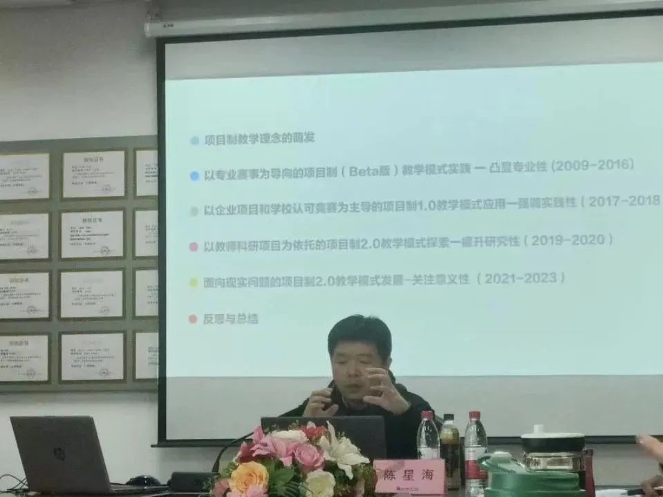 在此次讲座中,陈星海副教授结合自己的教学经验,深入浅出地介绍了项目制 2.0 教学模式的特点和优势,并通过实际案例详细讲解了如何在体验设计课程教学中应用项目制 2.0 教学模式。他指出,项目制 2.0 教学模式能够更好地培养学生的创新能力和实践能力,提高学生的综合素质,是课程教学改革的方向。随后,陈星海副教授与现场教师进行了互动交流,解答了大家关于项目制 2.0 教学模式的相关问题,并分享了自己在教学实践中的心得体会。