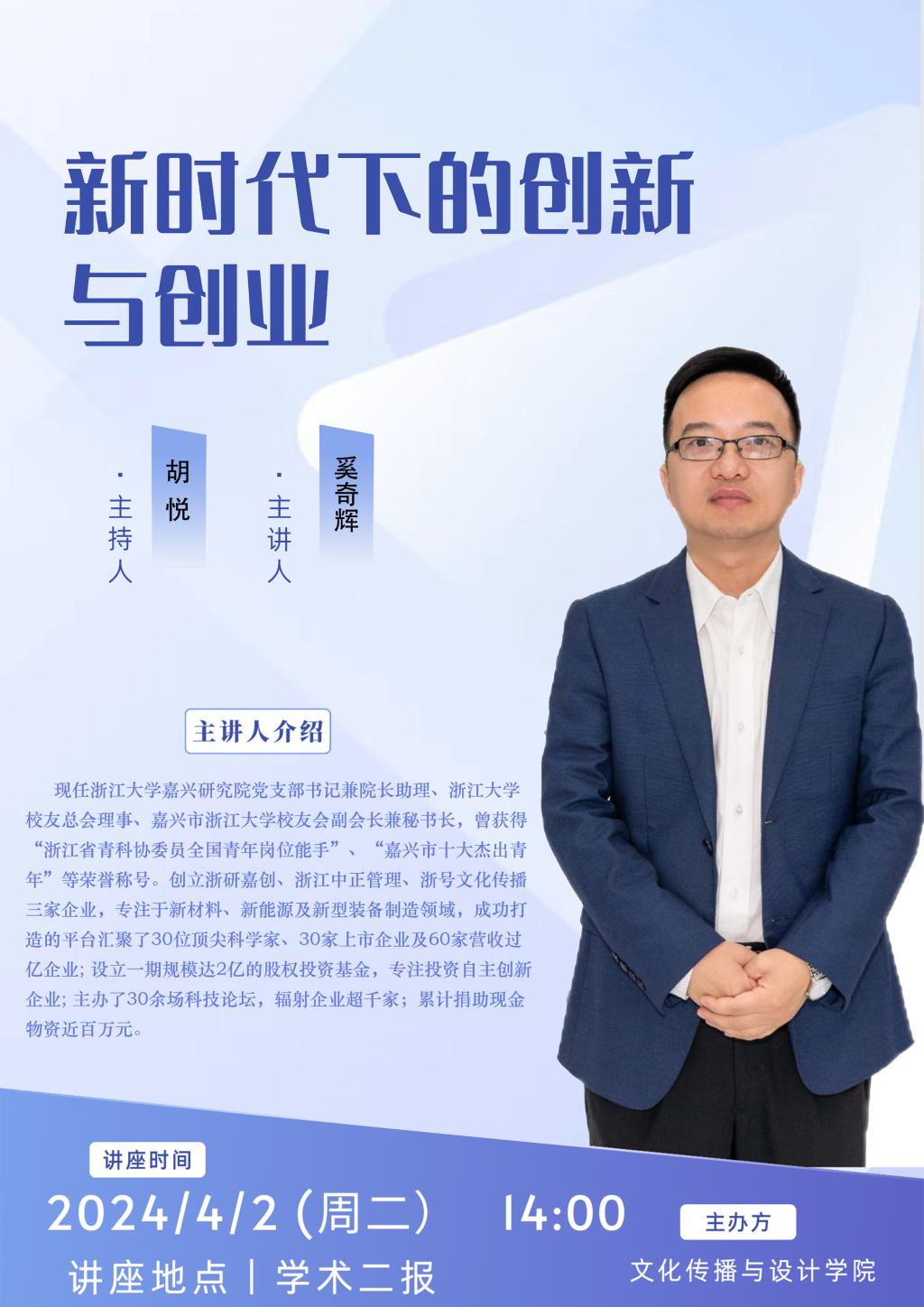 4月2日下午,为进一步拓宽同学们对创新创业的认知,我院邀请了资深企业家奚奇辉在学术二报开展了“新时代下的创新与创业”的主题讲座。