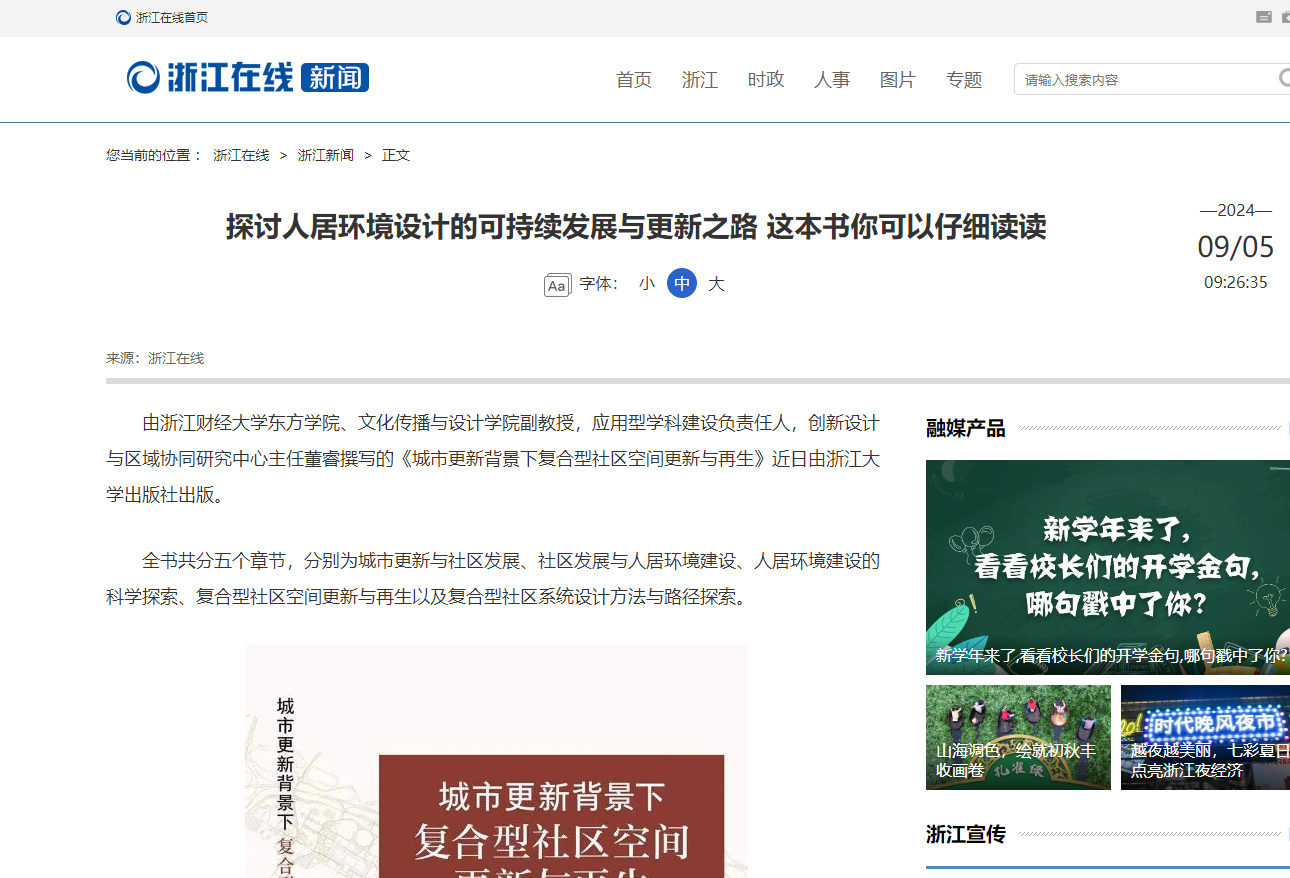近日,我院董睿老师撰写的《城市更新背景下复合型社区空间更新与再生》由浙江大学出版社出版。浙江在线新闻专栏以“探讨人居环境设计的可持续发展与更新之路这本书你可以仔细读读”为题进行推荐和解读。