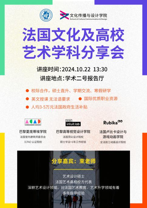 10月22日下午,“2024法国文化及高校艺术学科分享会”专题讲座在学术二号报告厅顺利举办。该讲座由法国艺术高校校方代表束老师主讲,来自各学院200余名同学,尤其是文设学院四个设计专业的同学,怀着浓厚的兴趣全程参与。