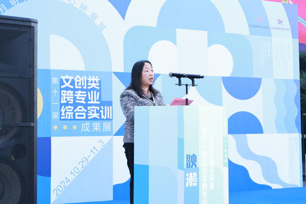 紧接着,文设学院吴智斌院长发表了致辞。她分享了文创类跨专业综合实训课程的亮点与成果,强调了真实项目融入与跨专业合作的重要性,并对课程未来的发展提出了思考,表示要敢于打破常规,勇于尝试新的教学理念和技术,以适应不断变化的行业需求。