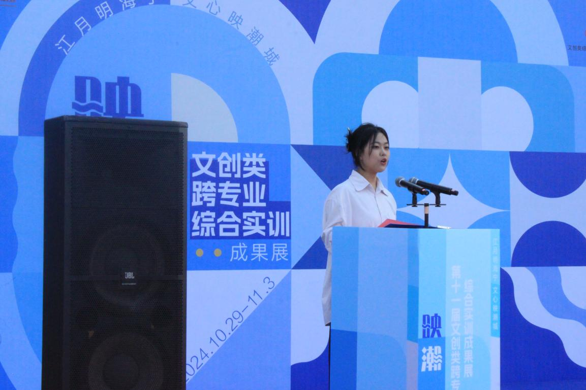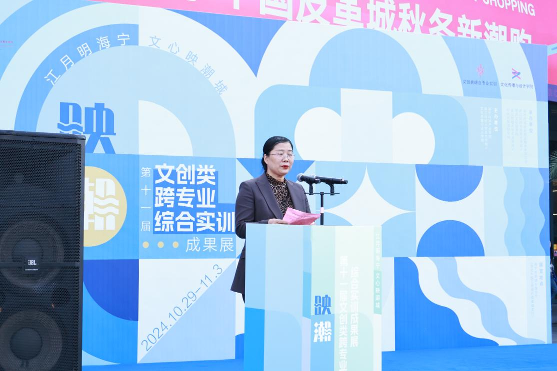 最后,浙江财经大学东方学院杨丽霞老师发表了致辞并宣布成果展正式启动。她表示,此次实训展是文设学院全面贯彻落实“新财经”发展战略、推进产教融合工作的重要成果。她希望以此次展览为契机,继续加强跨专业合作,推动海宁乃至更广泛地区的文化创新和产业发展。