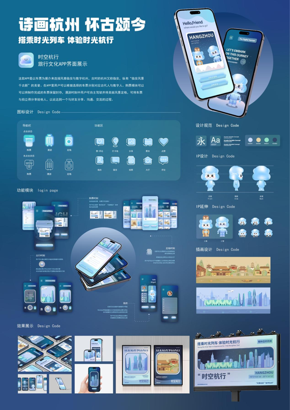 《诗画杭州,怀古颂今UI界面设计》是一款结合杭州古今文化的创新型应用程序(App),以车票为媒介连接“风雅临安”与“数字杭州”两个时空。前期设计调研时,她们查找收集了大量资料,了解到杭州古称临安,以“临安风景千古新”而闻名。因此,她们希望通过这款App带领用户穿越时空,领略古今杭州的独特魅力。