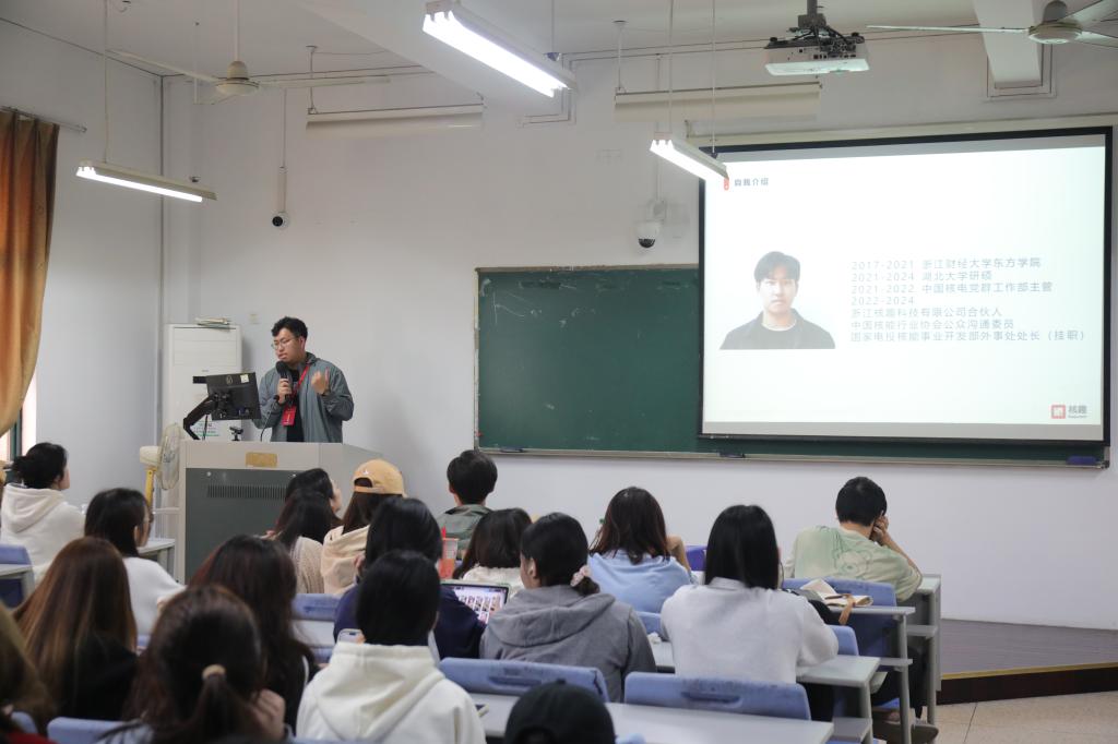 随后,俞博洋学长率先登台,分享了他的创业心得。作为浙江核趣科技有限公司的合伙人,俞学长不仅介绍了公司的组织架构、客户评价、服务内容、所获奖项、技术资质以及设计作品,还分享了他在创业路上的深刻感悟。他强调,在创业之前,应先在大公司历练,掌握基本的商业逻辑;只有当兼职收入与工作收入持平时,才应考虑创业。他总结道:“人无我有,人有我优,在相似中寻找差异。”此外,俞学长还分享了管理方法与考研经验,并以一句富有哲理的话激励大家:“拥抱迷茫,迷茫是自由的眩晕感。先有浅薄,而后才有辽阔。不要纠结于注定无知的青春。”