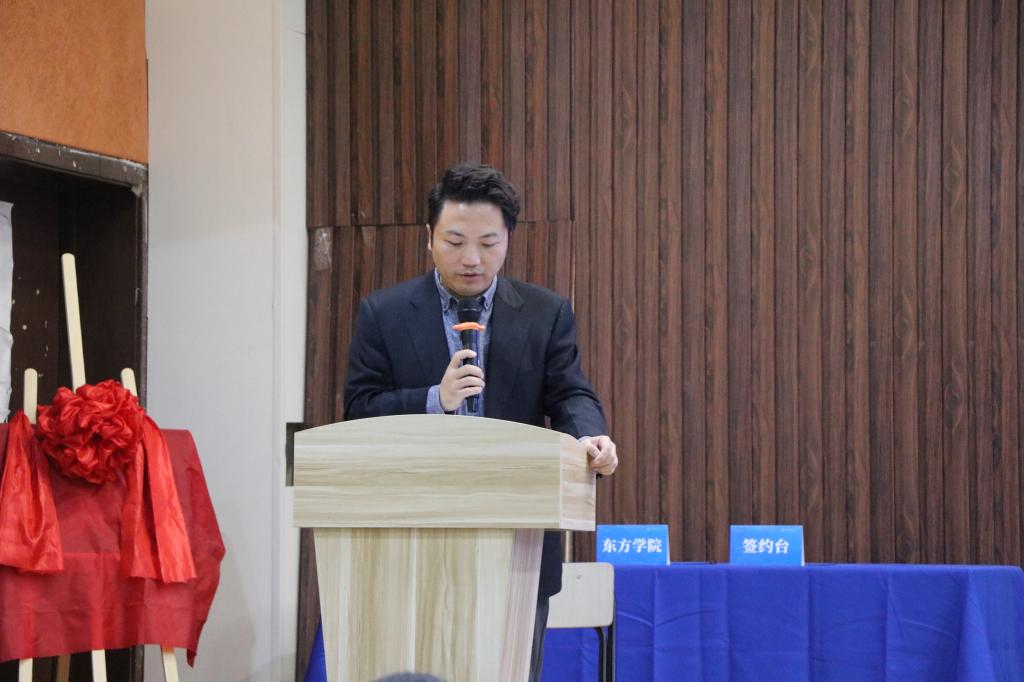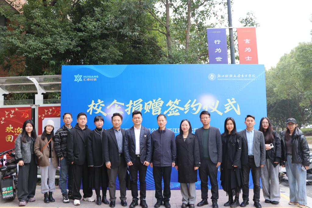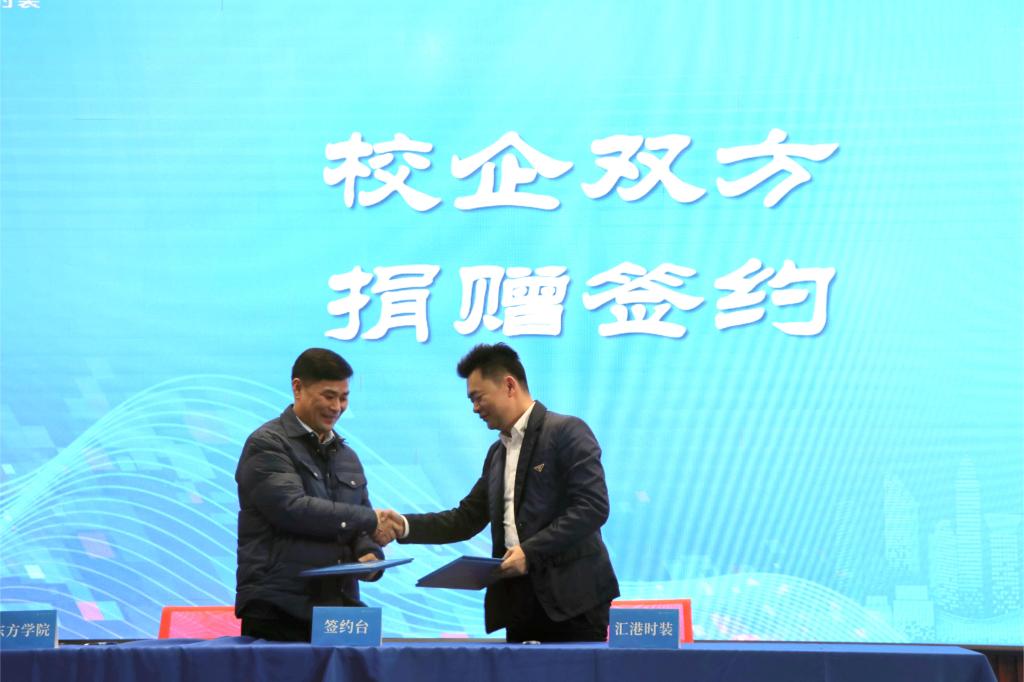 在捐赠签约环节,浙江汇港时装有限公司董事长沈强与东方学院资产管理部部长杜晗君分别代表校企双方签署了捐赠协议,并合影留念。