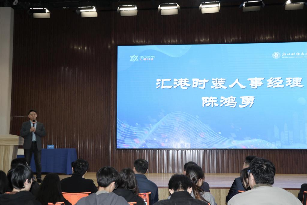 浙江汇港时装有限公司人事经理陈鸿勇代表企业方发言,介绍了浙江汇港时装有限公司的概况以及发展历程,陈鸿勇对我院举办的此次捐赠仪式表示郑重感谢,他表示,浙江汇港时装有限公司非常关心和支持学校教育事业的发展,希望能与浙江财经大学东方学院搭建交流平台,开展深层次的合作,实现校企资源共享,为针织服装行业发展提供技术支持和人才保障。