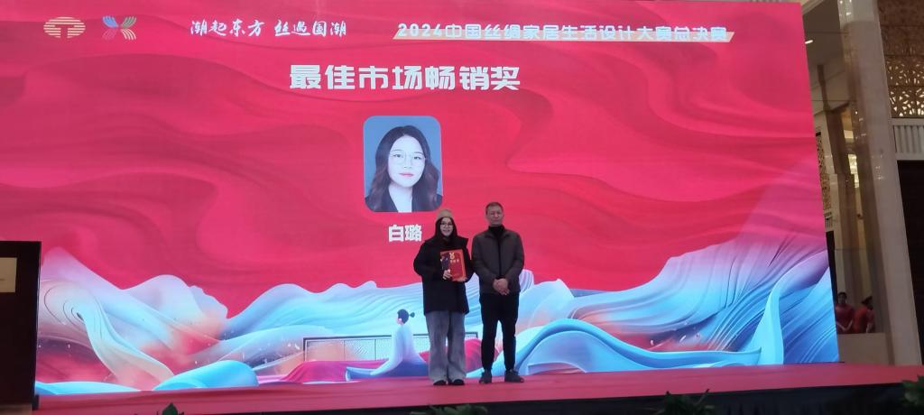 近日于苏州举办的2024中国软装创意大会暨金纺锤·中国软装美学空间设计大赛、2024中国丝绸家居生活设计大赛总决赛中,浙江财经大学东方学院文设学院的白璐老师凭借其出色的设计才华,为海宁市斯泰堡纺织有限公司设计的丝绸面料陈设空间作品,成功荣获全场唯一的最佳市场畅销奖。为学院赢得荣誉的同时也彰显了横向科研成果赋能校企合作转化的丰硕成果。