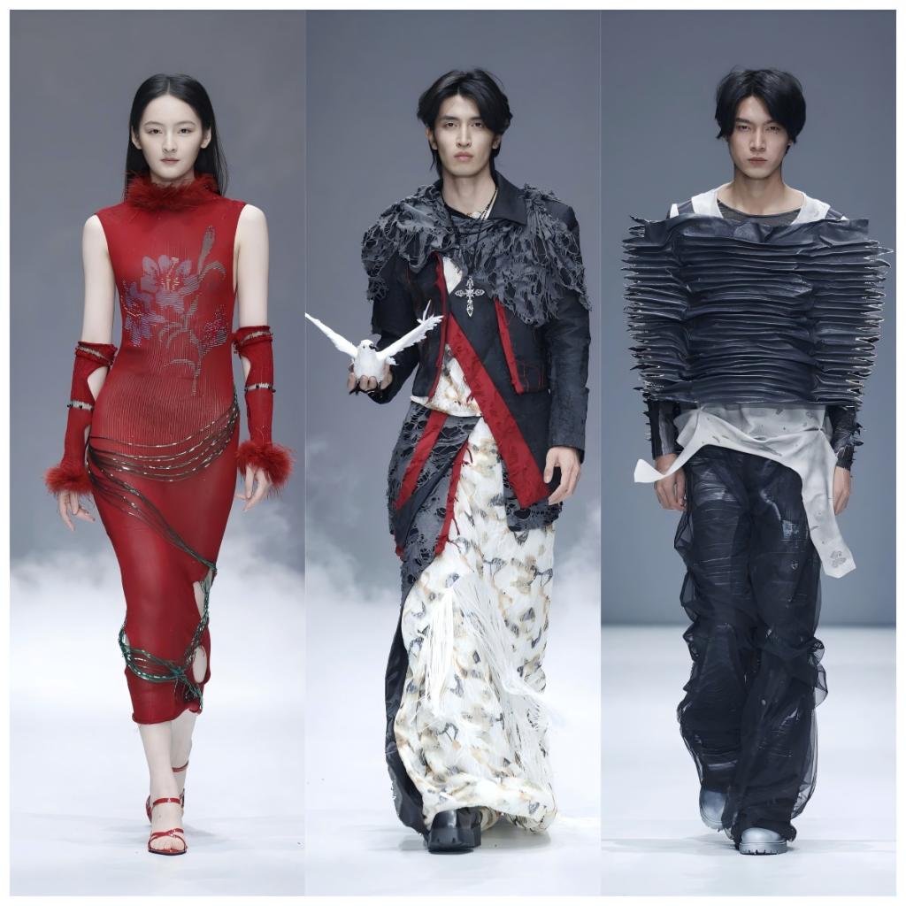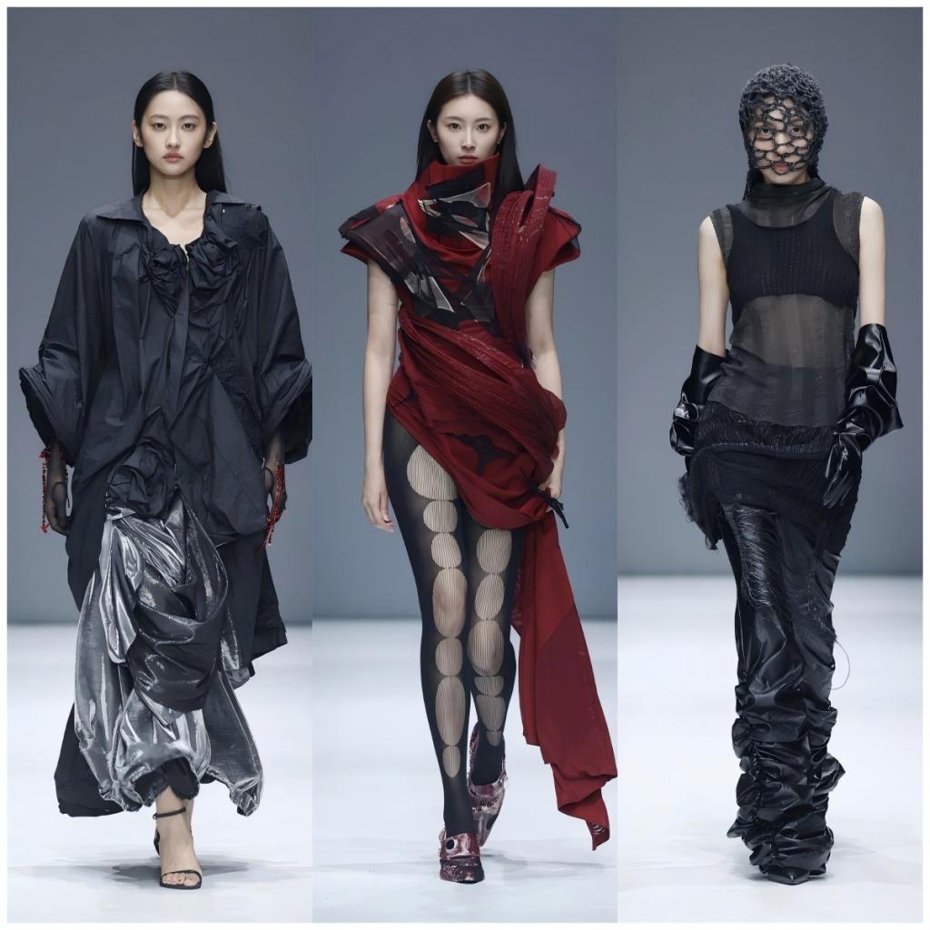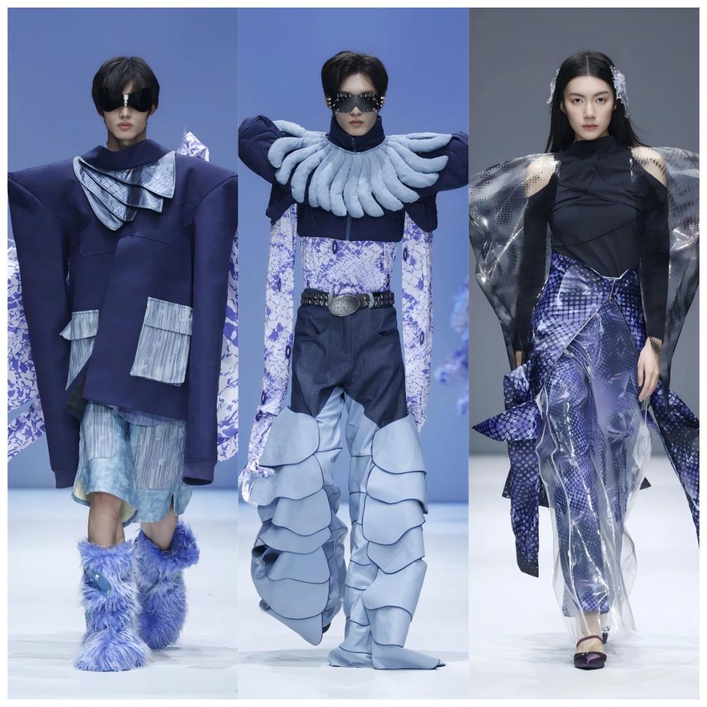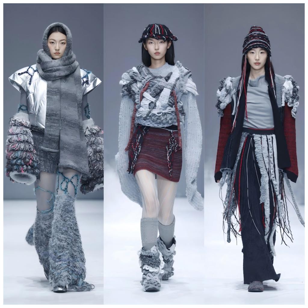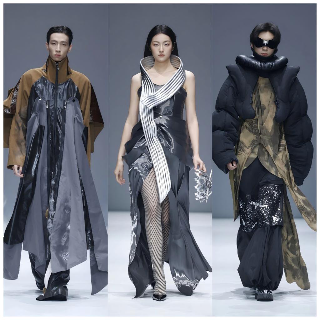 一套套作品相继登场,涵盖女装、男装及童装,融合“时尚 + 文化”“时尚 + 非遗”“时尚 + 数智”三大设计方向。第一篇章“时尚・文化”以钱江潮涌为灵感,运用立体剪裁与像素化山水纹路,将传统美学与现代设计完美融合。第二篇章“时尚・非遗”将羊毛毡与智能温控纱线结合,让非遗技艺在创新中焕发新生。第三篇章“时尚・数智”则借助AIGC技术,将赛博格元素与传统工艺相结合,展现了科技与手工的和谐共生。三大篇章交相辉映,追溯东方传统文化,传承非遗技艺薪火,致敬未来科技浪潮。