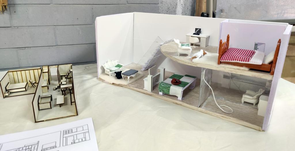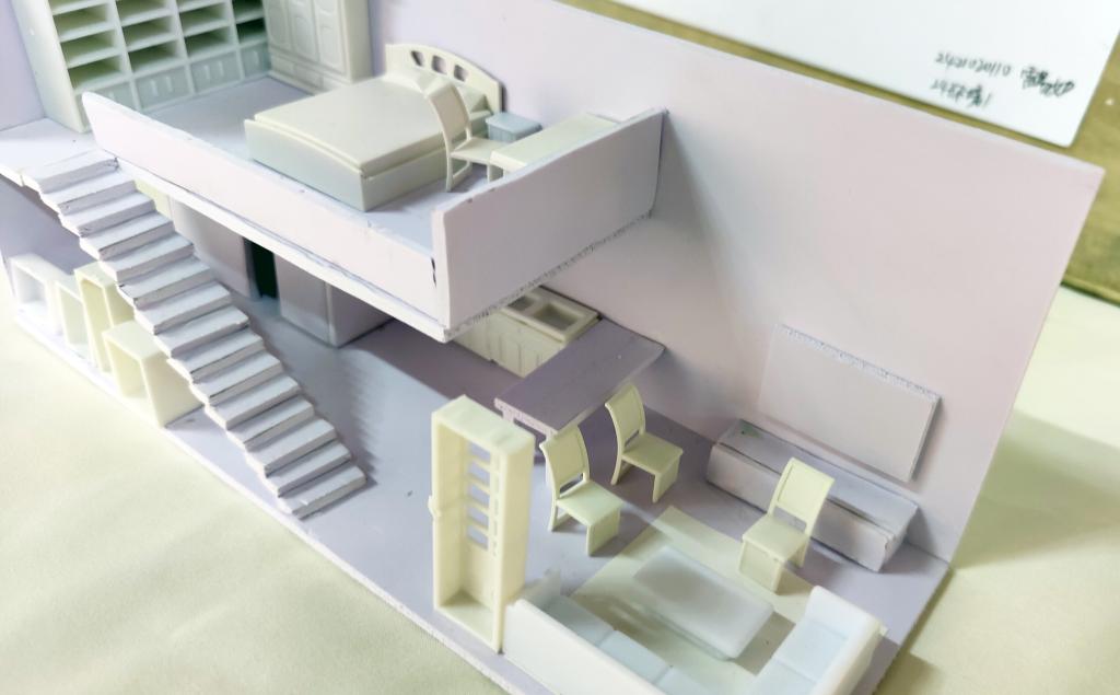 课程终段,以LOFT户型室内设计为案例,将学生们在前期实践中积累的知识与经验进行综合运用。学生们分组合作,针对LOFT户型的独特空间结构,进行了用户卡片的设定,空间功能布局与家具设计,经过数周的努力,完成了室内设计方案的设计与手绘,并制作出了户型与家具模型。