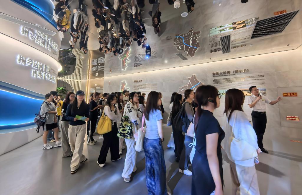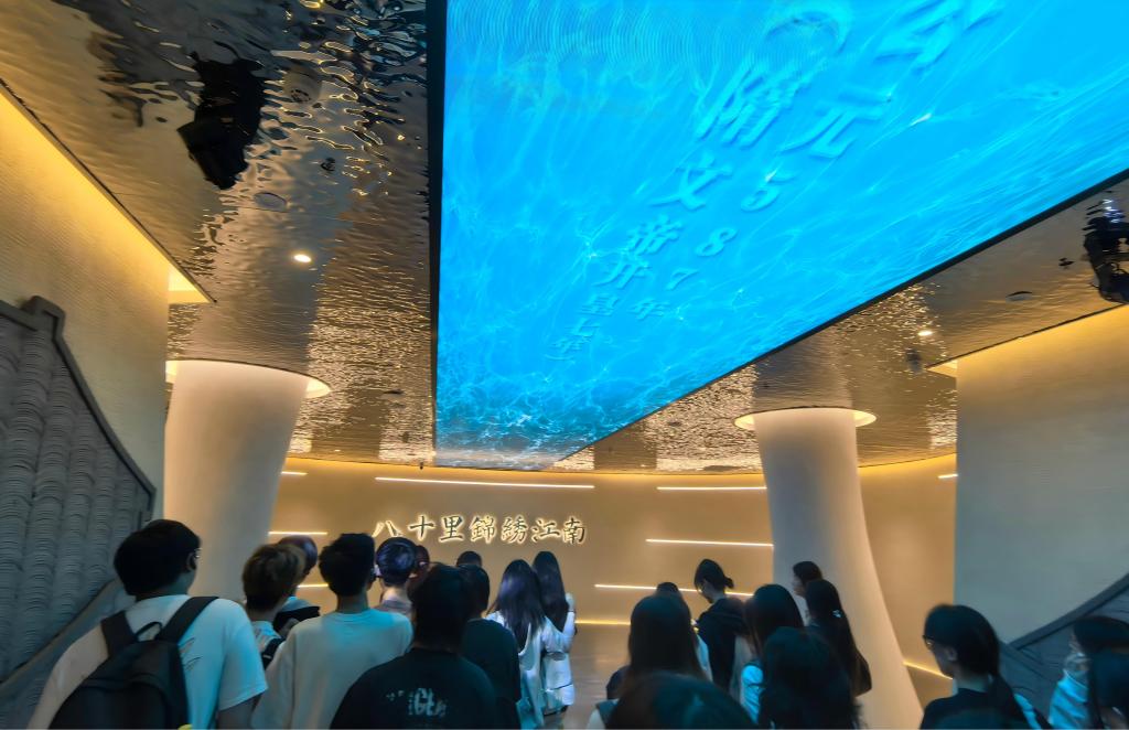 10月16日,考察团队抵达桐乡,在文化体验与企业交流中追溯纺织源头、了解非遗扎染工艺。上午,师生走进八十里锦绣江南运河文化馆,沉浸式感受桐乡的运河与桑蚕文化底蕴。馆内丰富的史料、实物与多媒体展示,让学生直观了解“丝绸”这一服装重要面料的文化起源与发展。