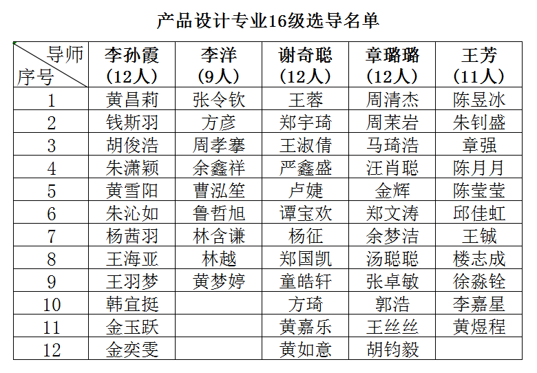 2016级产品设计专业选导名单已经确定,请见以下表格。