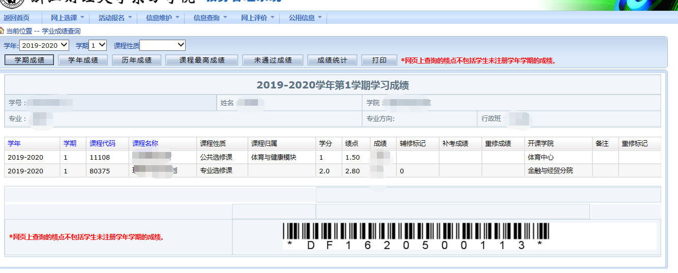 学生登陆教务系统,截图自己的成绩,需要体现姓名和各个课程成绩。请见下图示范。